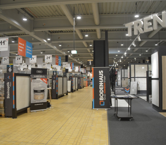 Denn Bodenhaus definiert sich eben ganz als Fachhandelskonzept und tritt auch in Mainz-Kastel so auf. Mit seinem lagergeführten Sortiment von mehr als 1.000 Fliesen, 300 Parkett-, Laminat- und Vinylböden sowie mehr als 200 Terrassenbelägen richtet es sich an Profi-Handwerker und mobile Generalisten, aber auch an Privatkunden, die ihr Projekt selbst in die Hand nehmen und den Boden selbst verlegen oder verlegen lassen. Deren Anteil am Bodenhaus-Umsatz betrug bislang rund 65 Prozent.