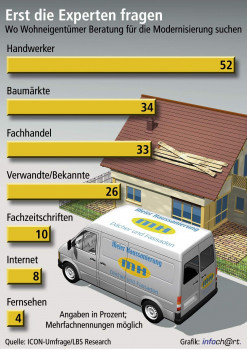 Trotz Internet und elektronischer Medien verlassen sich laut Umfrage unter 10.000 Haushalten Wohneigentümer in erster Linie auf die persönliche kompetente Beratung, vor allem beim Handwerker. Über 52 Prozent, so stellte das Nürnberger Marktforschungsinstitut ICON fest, informierten sich hier. Bei größeren Modernisierungsmaßnahmen liegt dieser Anteil sogar noch deutlich höher. Auf Platz zwei folgen – mit rund einem Drittel – die Baumärkte bzw. der Fachhandel (Mehrfachnennungen waren möglich). Ein Viertel der Modernisierer unter den Wohneigentümern informierte sich bei Verwandten, Bekannten oder Freunden. Zeitschriften als Informationsquelle lagen mit zehn Prozent noch vor dem Internet (acht Prozent) und Fernseh-Verbrauchersendungen (vier Prozent). Die Befragung wurde im Auftrag der Landesbausparkassen (LBS) durchgeführt.