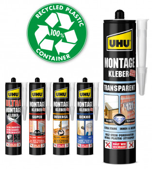 Das neue Uhu-Montagekleber-Sortiment ist ab sofort in innovativen, umweltfreundlichen Kartuschen erhältlich, die zu 100 Prozent aus Recycling-Material bestehen: Uhu-Montagekleber Dekor ist ideal für Montagearbeiten im Innenbereich geeignet, Uhu-Montagekleber Universal mit extra starker Anfangshaftung für Montagen im und am Haus, Uhu-Montagekleber Super dank super starker Soforthaftung für schwere Materialien. Der Uhu Montagekleber Ultra ist der ultrastarke Universalist für alle Materialien und Oberflächen. Der neue Uhu Montagekleber Transparent ist Weiß beim Auftrag und trocknet transparent und komplett unsichtbar. Er ist ideal für Anwendungen im Sichtbereich. Er garantiert, so Uhu, eine hohe Fehlertoleranz und Sauberkeit.www.uhu.com