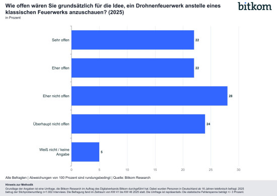 23 Prozent der Befragten würden es begrüßen, wenn anstelle offizieller Feuerwerke nur noch Drohnenshows stattfänden, bei denen beleuchtete Drohnen am Himmel Formationen und Muster zeigen. Jeweils 22 Prozent stehen dieser Idee „sehr offen“ oder „eher offen“ gegenüber. 28 Prozent lehnen es eher ab, 24 Prozent lehnen es komplett ab. Frauen zeigen sich dabei aufgeschlossener (48 Prozent) als Männer (39 Prozent).