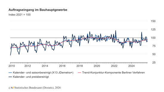 Gegenüber Oktober 2025 ist der reale Auftragseingang im Bauhauptgewerbe im Berichtsmonat um 8,5 Prozent gestiegen. Im Hochbau nahm er im Vormonatsvergleich um 7,2 Prozent und im Tiefbau um 10,1 Prozent zu. Im weniger volatilen Dreimonatsvergleich lag der kalender- und saisonbereinigte Auftragseingang von September 2025 bis November 2025 um 3,8 Prozent höher als in den drei Monaten zuvor (Hochbau: +5,1 Prozent; Tiefbau: +2,6 Prozent).